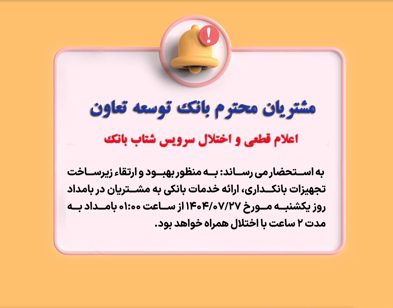 اعلام قطعی موقت سرویس شتاب بانک توسعه تعاون