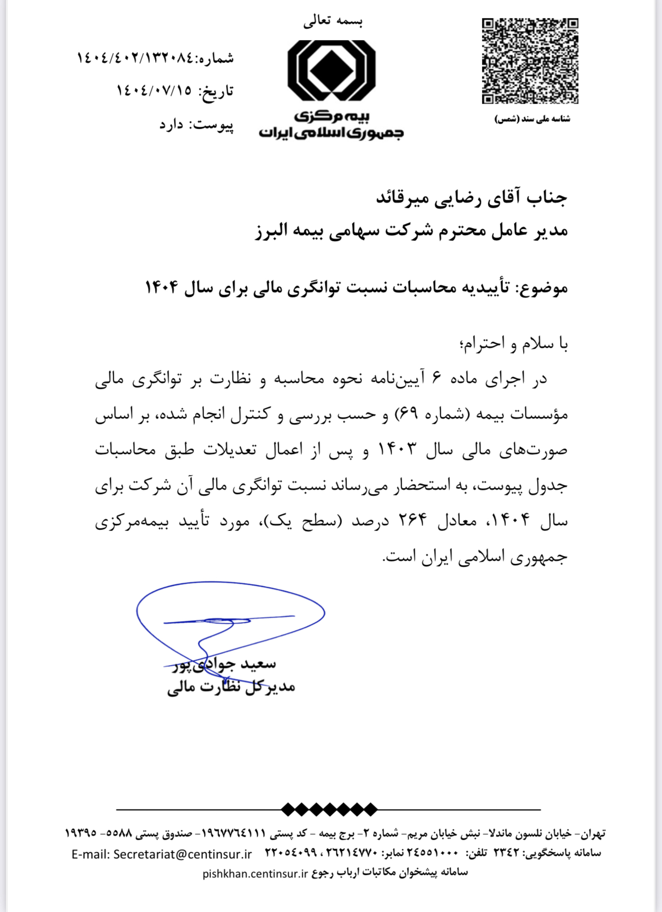 تأیید سطح یک توانگری مالی بیمه البرز از سوی بیمه مرکزی