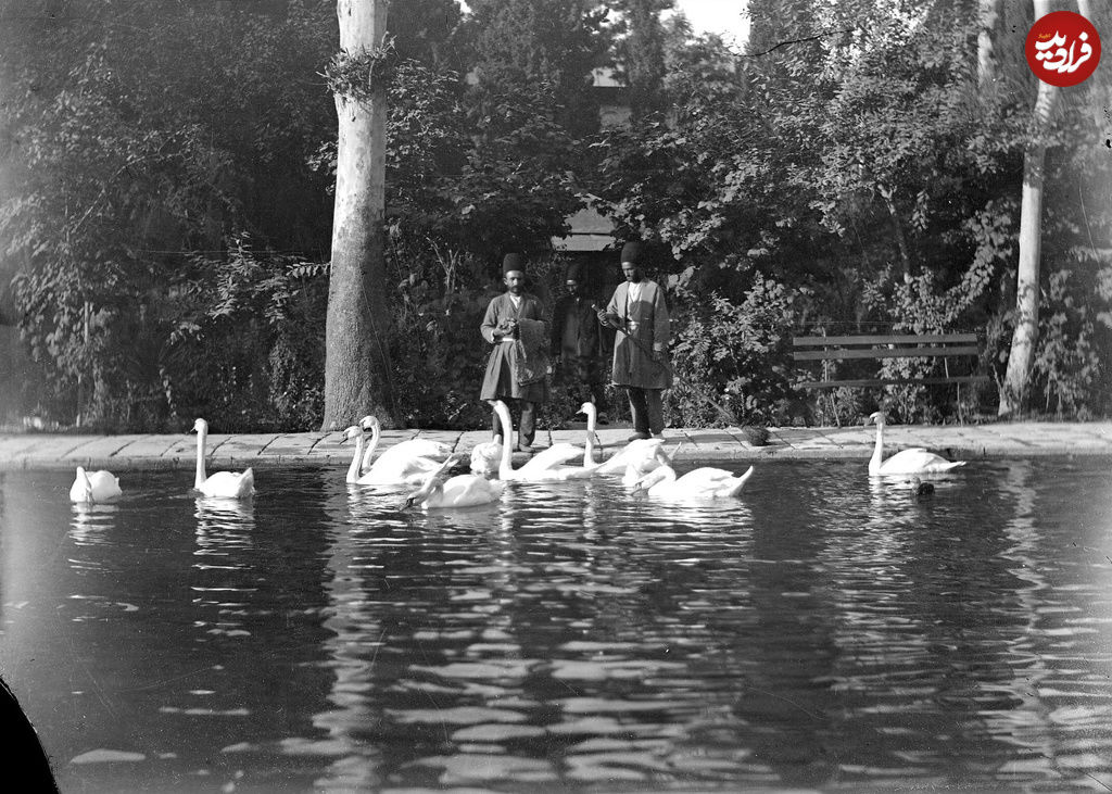 عکسی از سه خدمتکار کاخ گلستان را در دوران سلطنت ناصرالدین شاه در حال تماشای شنا کردن قوها در حوض بزرگ حیاط کاخ ملاحظه میکنید.