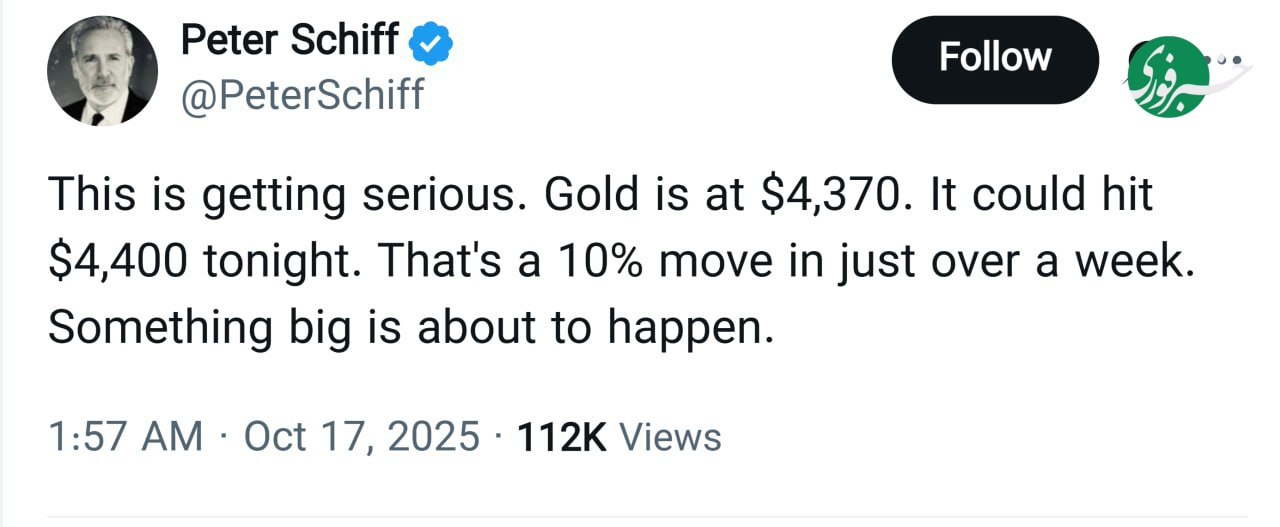 به گزارش اقتصاد کده، پیتر شیف، اقتصاددان برجسته آمریکایی اعلام کرد: قیمت طلا هماکنون به ۴۳۷۰ دلار رسیده و پیشبینی میشود که امشب مرز ۴۴۰۰ دلار را نیز پشت سر بگذارد.