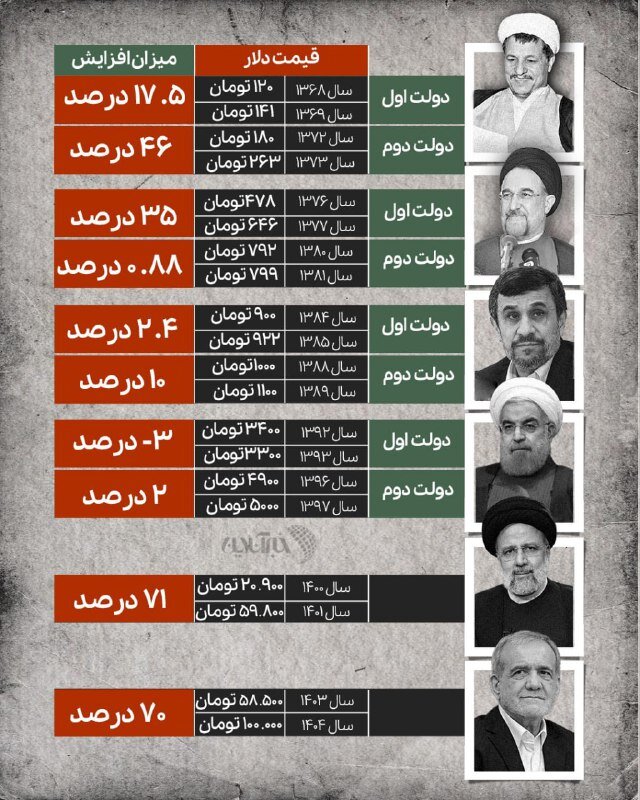 تغییر نرخ دلار در یک سال نخست ۱۴ دولت، مقایسه شده است؛ نمودی از وعدههای کنترل تورم تا واقعیت بازار آزاد. نوسانی که هر بار با سیاستی تازه آغاز شد و در نهایت، مسیر خود را ادامه داد.