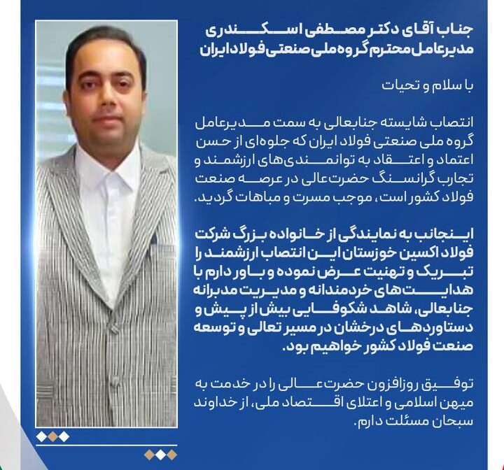 انتصاب شایسته جنابعالی به سمت مدیرعامل گروه ملی صنعتی فولاد ایران که جلوهای از حسن اعتماد و اعتقاد به توانمندیهای ارزشمند و تجارب گرانسنگ حضرتعالی در عرصه صنعت فولاد کشور است، موجب مسرت و مباهات گردید.
